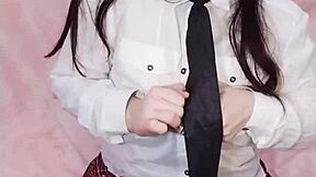 Curvy brunette secretary in stockings begs for cum in mouth during wet pussy masturbation.