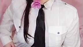 Curvy brunette secretary in stockings begs for cum in mouth during wet pussy masturbation.