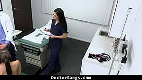 Lekarz podgląda badanie błony dziewiczej, dziewica jeździ w szpitalnym trójkącie