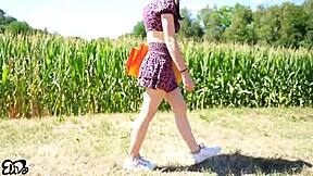 Girlfriend flashes big natural tits for horny cornfield blowjob