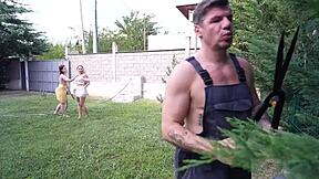 gardener bends nerdy brunette mileva over in garden for pussy licking and cumshot ride