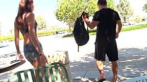 Kerel laat schatje zijn enorme lul slaan, ramt haar strakke kut en spuit op gezicht 😏