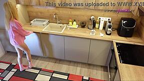 hot petite skinny blonde girlfriend teases in kitchen pink pullover