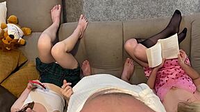 Hey, check these two college miniskirt girls stroking cock with no panties! 06:38