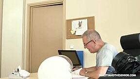 old boss corners horny teen secretary at desk for deepthroat blowjob