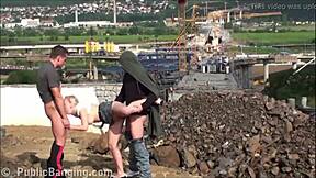 cute blonde teen does public threesome blowbang at construction site