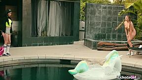 Lesbian teens dive into hairy pussies post-swim—whose tongue wins the lick-off?