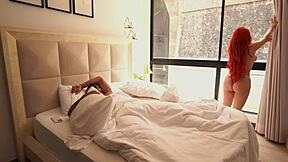 muscular guy spanks busty redhead lover's huge tits to start the morning