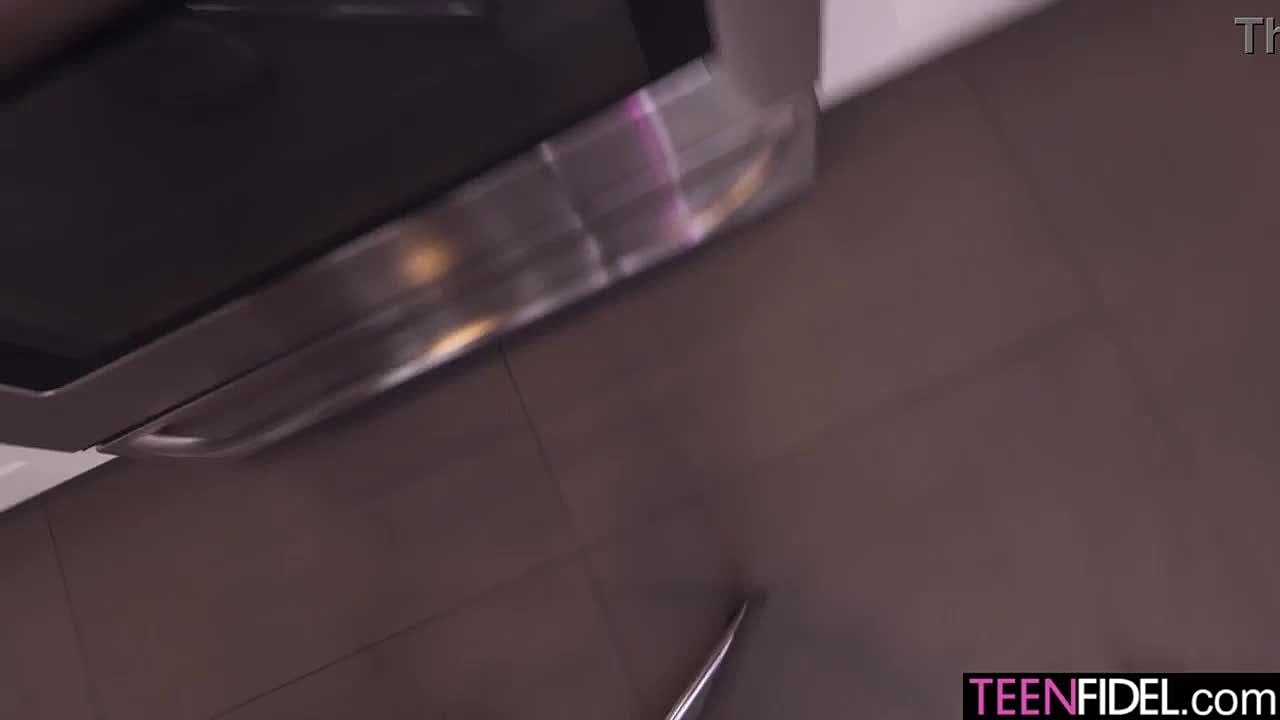 Straight Latina teen babe licks and scissors in kitchen with petite fingering masturbation for high definition orgasm.
