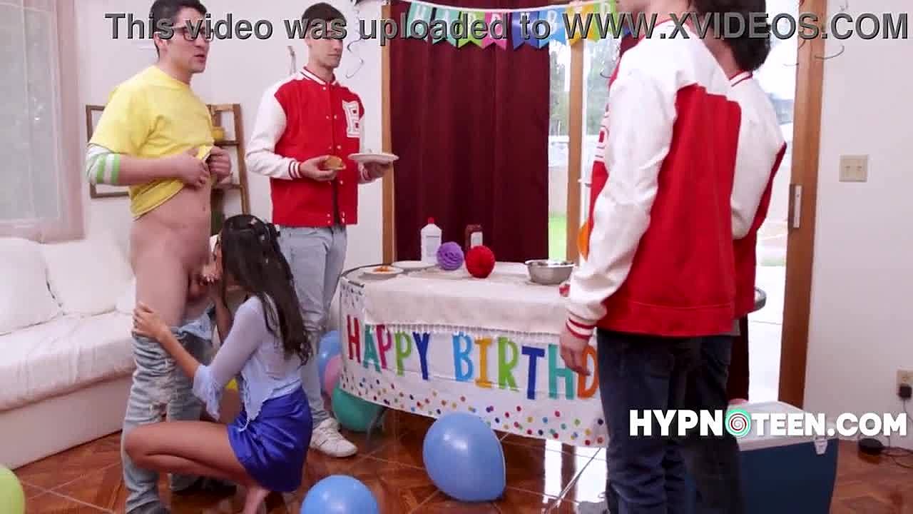 Three girls surprise boyfriend for his birthday. They give blowjob and doggystyle fucking with cumshot on tits.